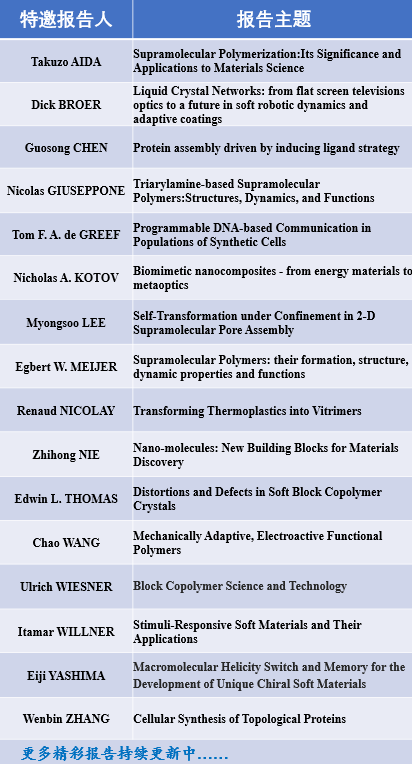 Edwin L. Thomas(美国工程院院士)、程正迪(美国工程院院士)、Egbert W. Meijer(欧洲科学院院士)、Itamar Willner(以色列科学院、欧洲科学院、德国科学院院士)、Virgil Percec(瑞典皇家科学院院士)、张希(中国科学院院士)及Takuzo Aida、Dick Broer、Nicholas A. Kotov、Ulrich Wiesner等20位国内外知名科学家及杰出中青年学者作深度学术报告。