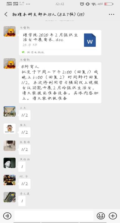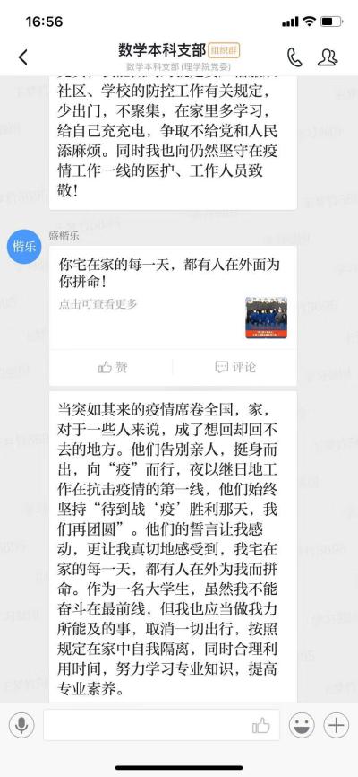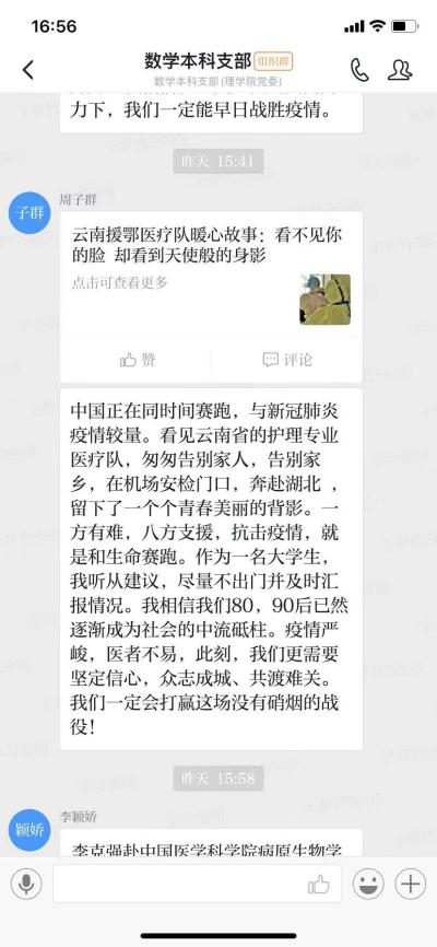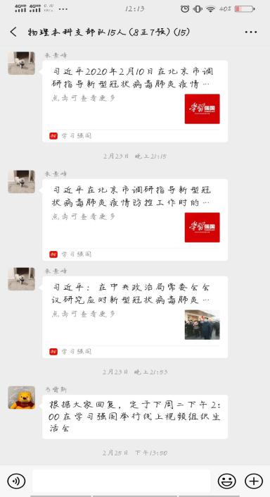 “这次疫情不仅仅是对我们哪个人或哪个家庭的考验,而是需要我们举国上下全民参与。我相信,全国人民再坚持一段时间,我们很快能打赢这场疫情保卫战”“在这次疫情攻坚战中,我看到了全国人民团结一致的力量,我相信很快就可以打赢这场疫情攻坚战”理学院各学生党支部利用“学习强国”平台,开展了这样一次别开生面的组织生活会。