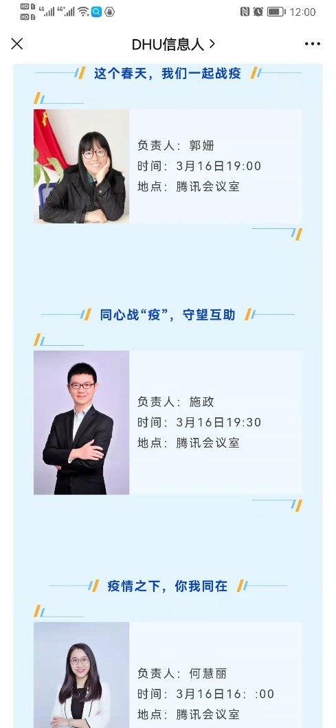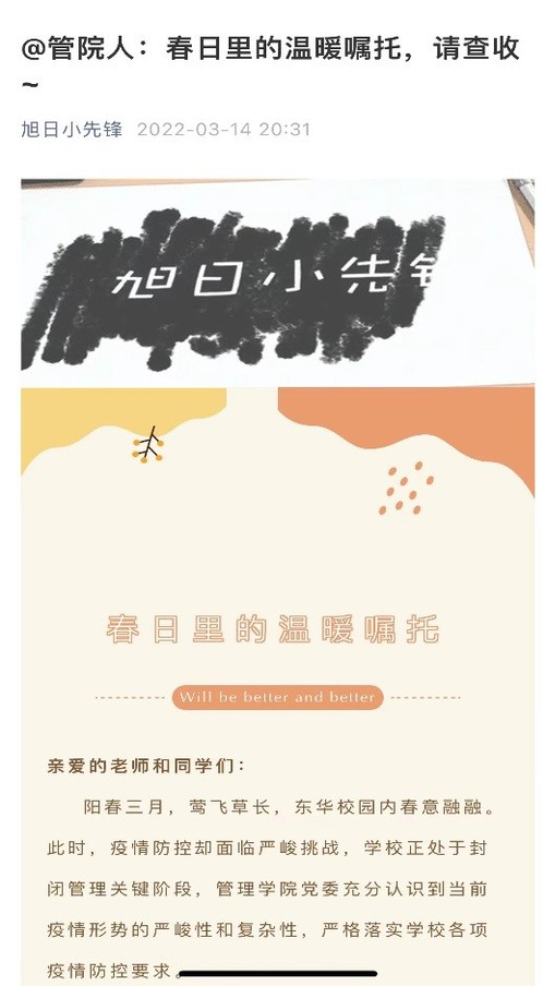 云班会、战疫手记、主题微课、心理漫谈……封闭管理期间,学校将战“疫”鲜活素材作为思政教育的生动教科书,推出了一系列丰富多彩的思政教育“大餐”,确保思政教育“不间断”、学生思想“不掉线”。旭日工商管理学院推出《致全体师生的一封信:春日里的温暖嘱托》,从思想引导、日常宣传、深度辅导等多维度,做好学生思政教育。机械工程学院利用“机动天下”、“东华机械人”等网络平台营造同心抗“疫”、共促良好学习氛围。信息科学与技术学院组织“同心战疫”系列线上主题教育活动,全体专兼职辅导员分层分类设计战疫故事分享、职业生涯规划、心理健康教育等课程,引导学生正确认识疫情防控政策,积极参加线上学习。化学化工与生物工程学院举办“勠力同心守望相助”、“保哥带你求职:学长学姐毕业去向与未来规划”线上主题班会,时刻关注学生学业与生涯成长。材料科学与工程学院有效发挥学生党员、学业帮扶小组、班导生等朋辈力量,针对学生个性化学习问题开展“点对点”辅导,贴心帮扶助力学生线上学习更高效。人文学院开展“云端互助学”活动,邀请关工委名师、红色导师、红色导生云上指导,助力学生高效在线学习。马克思主义学院开设“伟大精神”系列课程,师生共同录制“雷锋精神”线上微课,将中国共产党人精神谱系伟大精神云端传递。理学院开展防疫主题班会、主题党日活动,引导学生提高防范意识,共筑思想引领和疫情防控双重防线。心理健康教育与咨询中心开设“心理漫谈”系列线上讲座,多角度、多主题为学生提供心理健康小贴士;增设线上心理咨询、邮箱咨询预约等方式,多渠道保障学生心理健康。丰富多彩的思政教育充实了学生的校园生活,多次担任核酸检测志愿者的学生小何说,“学校封闭管理期间,食堂每日三顿的美食让我长了“肉肉”,老师们打造的精神食粮大餐更让我涨了知识,也让我们更有动力,为学校抗疫工作做点力所能及的事”。