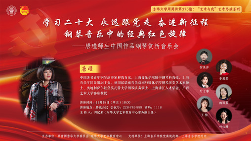 本次活动邀请到中国著名青年钢琴演奏家和教育家、上海音乐学院民盟副主委唐瑾教授,以钢琴奏响红色旋律,用钢琴讲述中国故事,唤起师生对革命历史的怀念和记忆,激发文化自信,为全面建设社会主义现代化国家而团结奋斗。活动将由唐瑾主持主奏并对曲目进行讲解,带领学生共同演奏。曲目包括《浏阳河》《山丹丹花开红艳艳》《翻身的日子》《社员都是向阳花》《保卫黄河》等经典红色钢琴音乐。