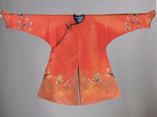(砖红绸平金绣金龙海水纹儿童吉服袍 19世纪后期)