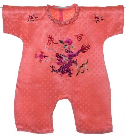 一条宝宝田鸡裤充分体现了中西服饰文化的交融。田鸡裤和现代的婴儿连体衣颇为相似,此件田鸡裤,圆领,连身袖。面料为桔红缎,彩绣龙凤及“百岁”二字。领口处镶褶边,后中揿扣三副。为婴儿着装。田鸡裤应系西方输入之物,但其面料之选择及装饰之图案,多传统意趣,且一经输入,即被广泛应用。