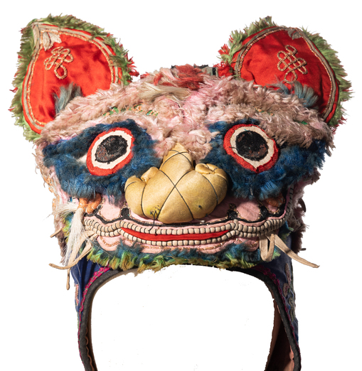 虎头虎脑,茁长成长。此件为馆藏儿童虎头帽,童帽作为儿童服饰的重要组成部分,最主要的作用是保护儿童相对脆弱的头部不受伤害,并且起到保暖的功能,除此,还具备礼仪和装饰的作用。虎头帽以彩色布料拼缝制成老虎的耳朵、鼻子、嘴巴等,兽面五官凸出、形态夸张活泼、色彩明快艳丽,层次分明。虎头形象被认为具有驱邪辟恶的威力,常赋予孩子虎头虎脑、无病无灾、茁壮成长之意。