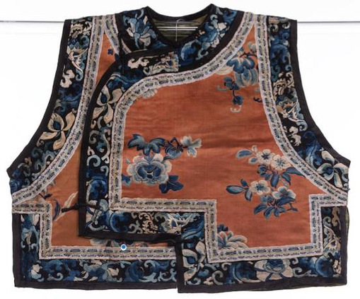 (银红缎地三蓝绣花卉纹琵琶襟坎肩 19世纪后期)
